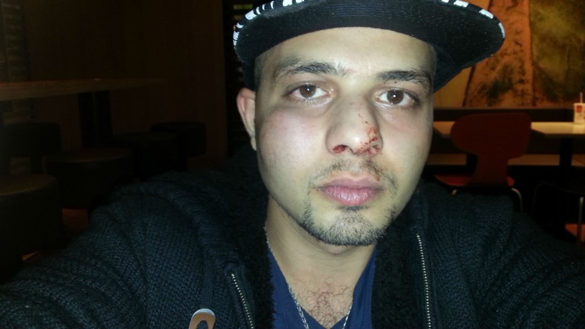 Ehsan forsøger sig venligt med at tilbyde manden noget af deres mad. Men situationen eskalerer hurtigt, og snart har overfaldsmanden taget kvælertag på vennen. Da Ehsan forsøger at få ham til at give slip, modtager han et slag, der brækker hans næse. Situationen ender med, at vagten griber ind og tilbageholder gerningsmanden, som kaster om sig med racistiske gloser mod Ehsan og hans kammerat. Dele af forløbet bliver optaget af overvågningskameraer.